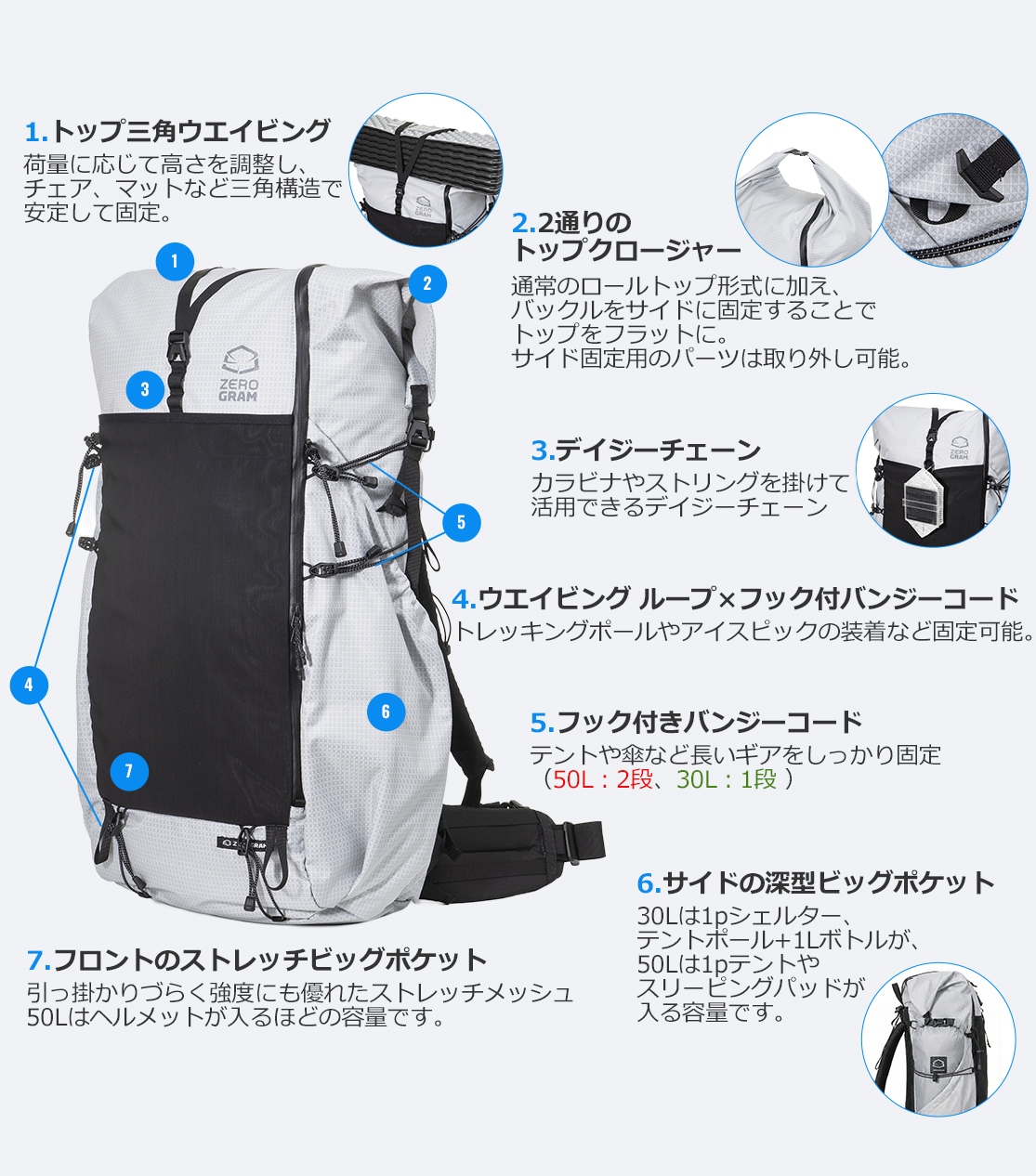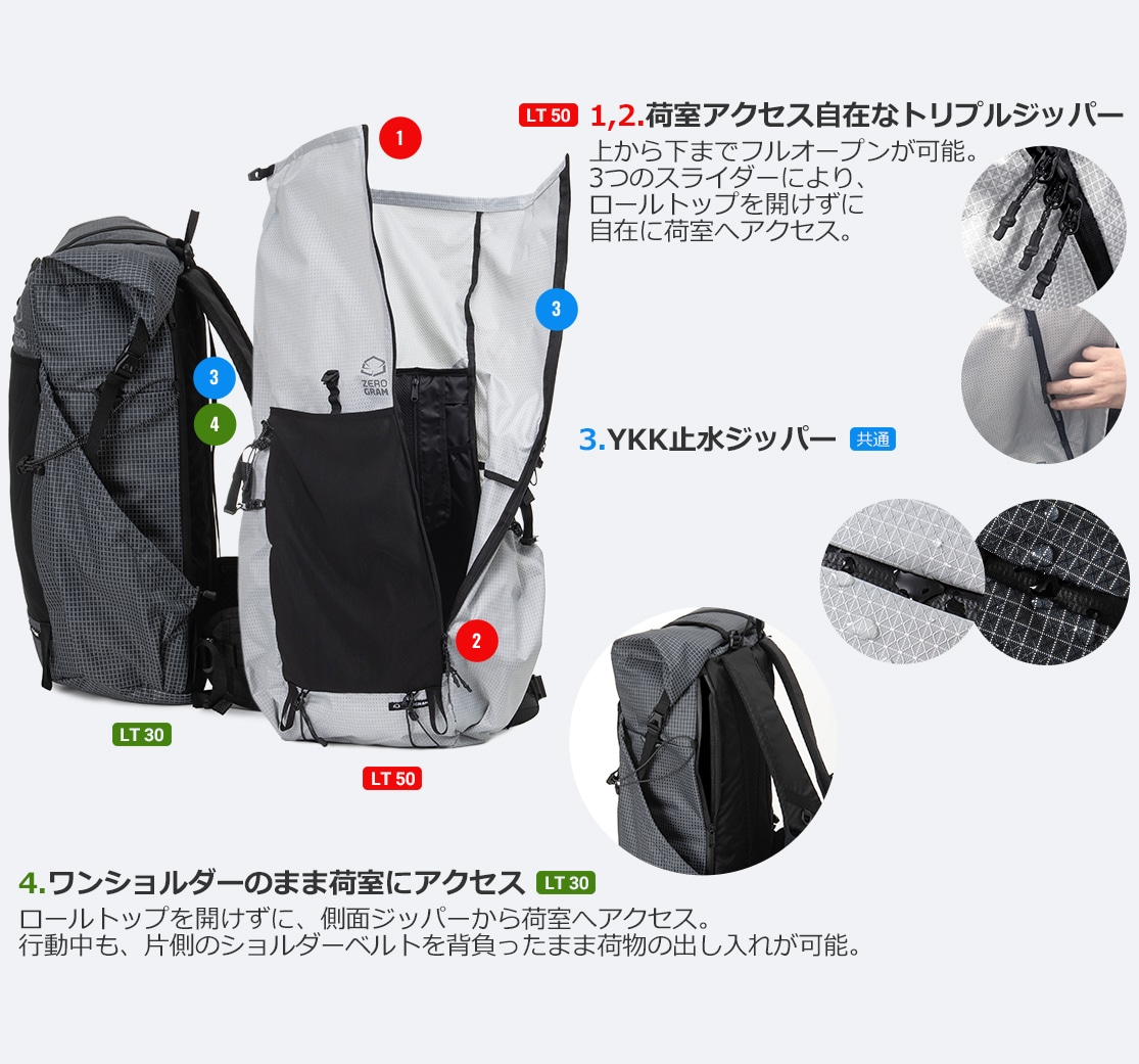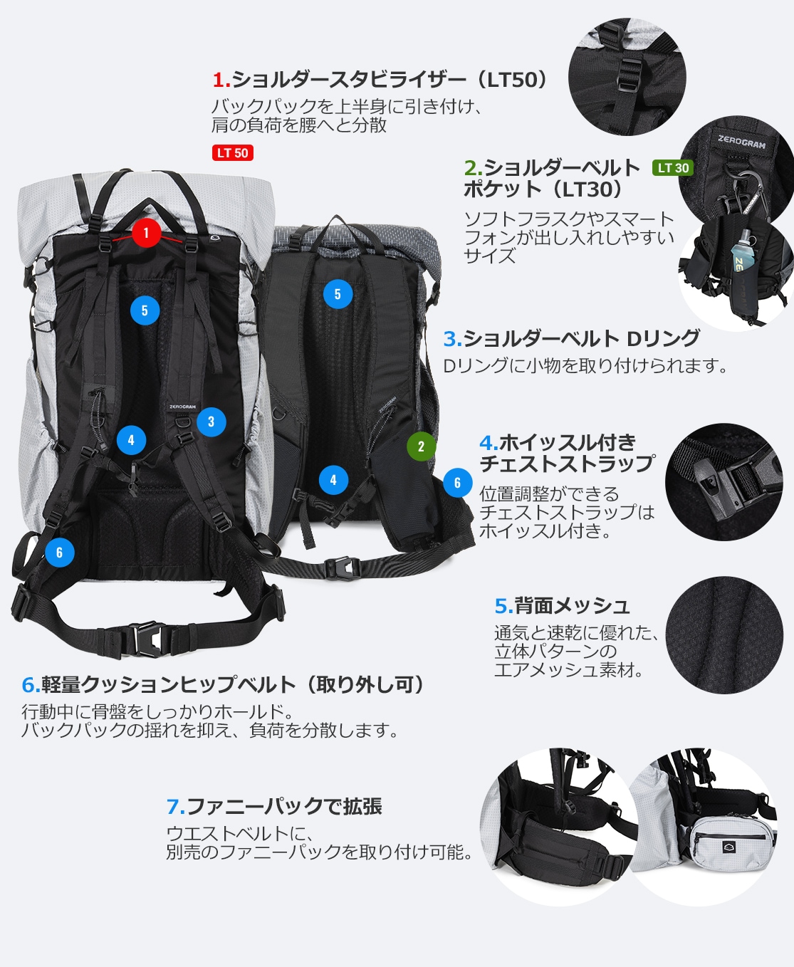 50L/30/FannyPackの主な機能は下記をご確認ください。