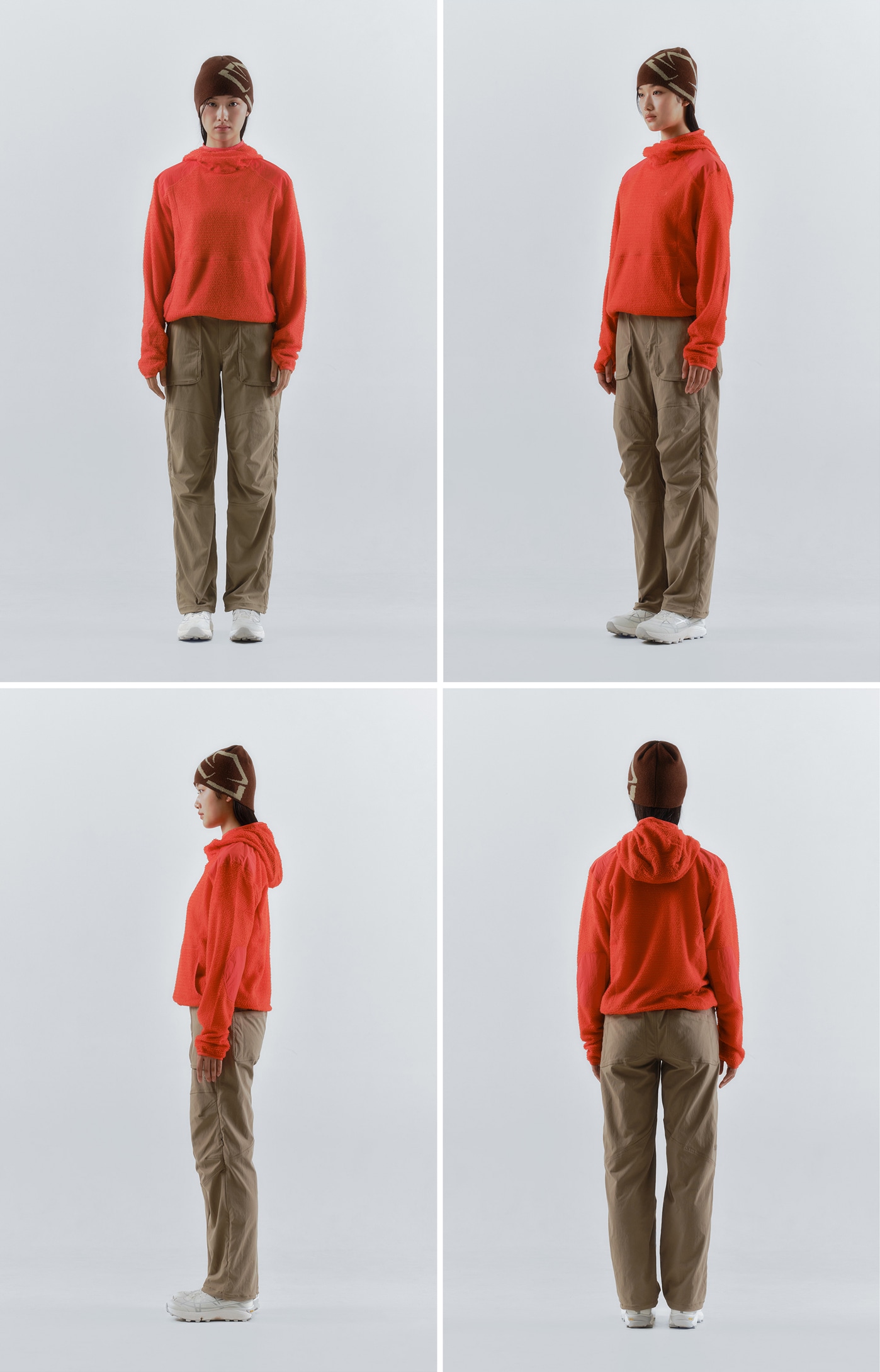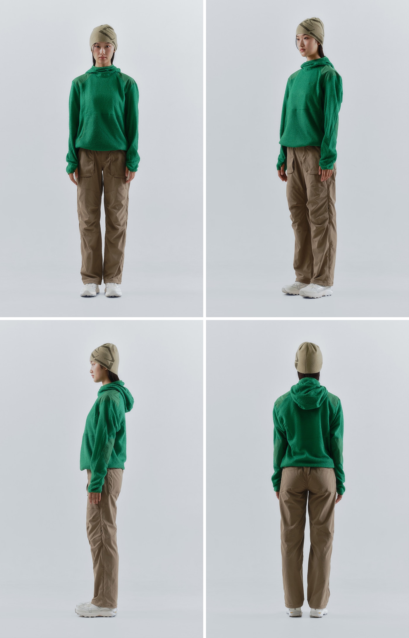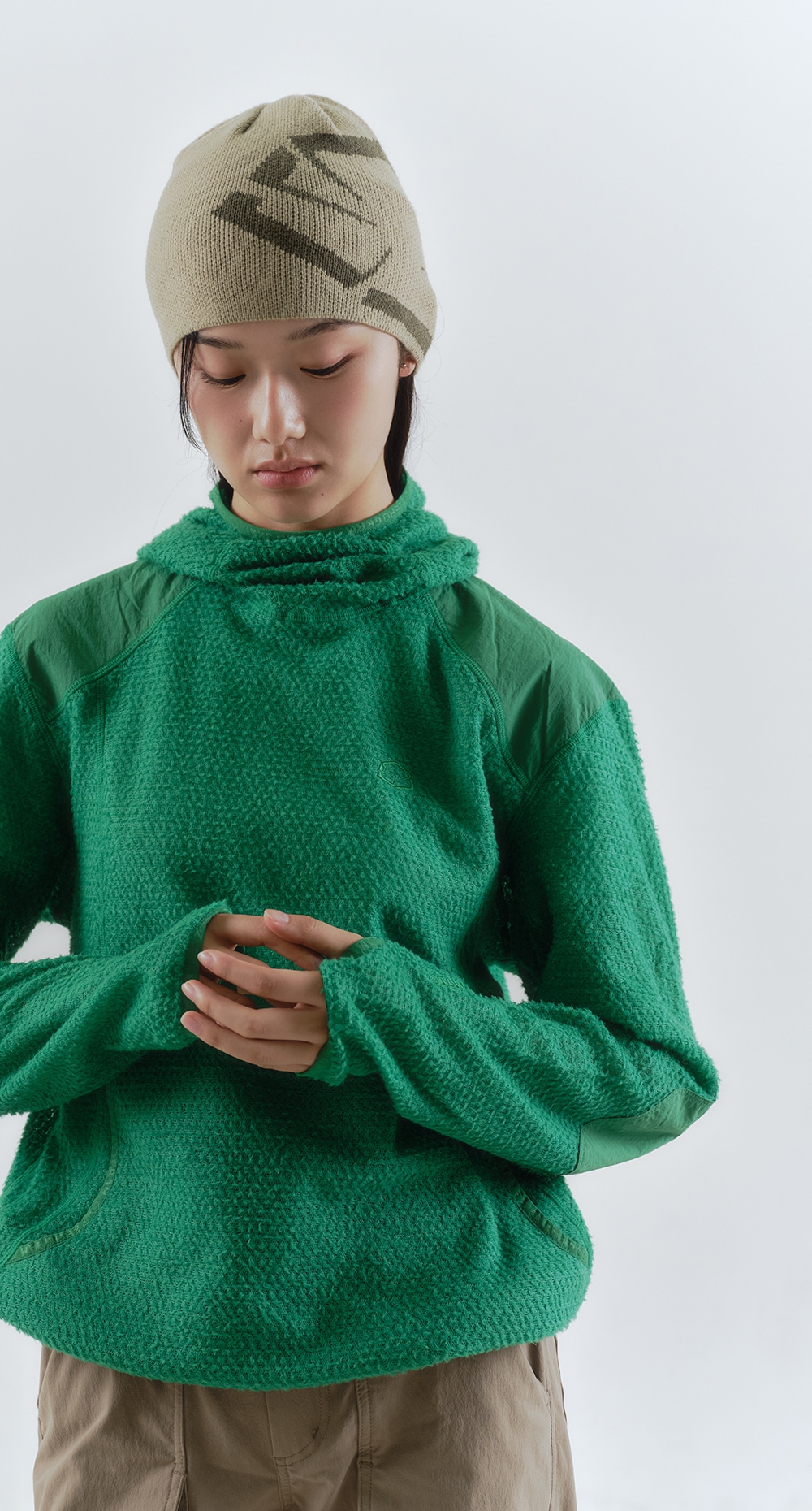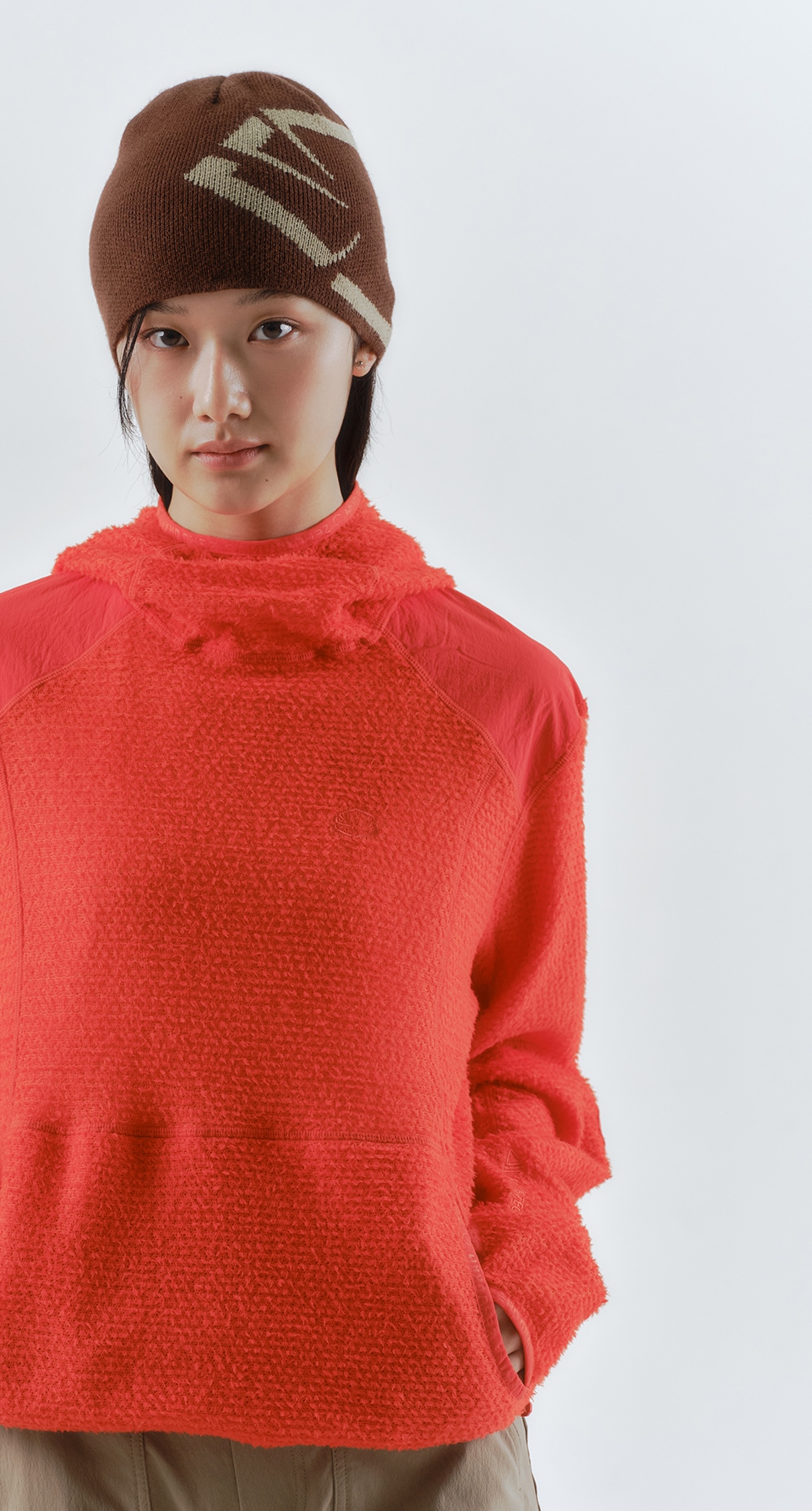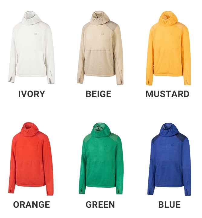 バラクラバ型フードを備えたアノラック仕様。ゆとりを持たせた立体的なフードデザインで、未使用時は首まわりを包み込み、キャップ上からでもさっと被ることができます。フロントに大きなカンガルーポケット付き。