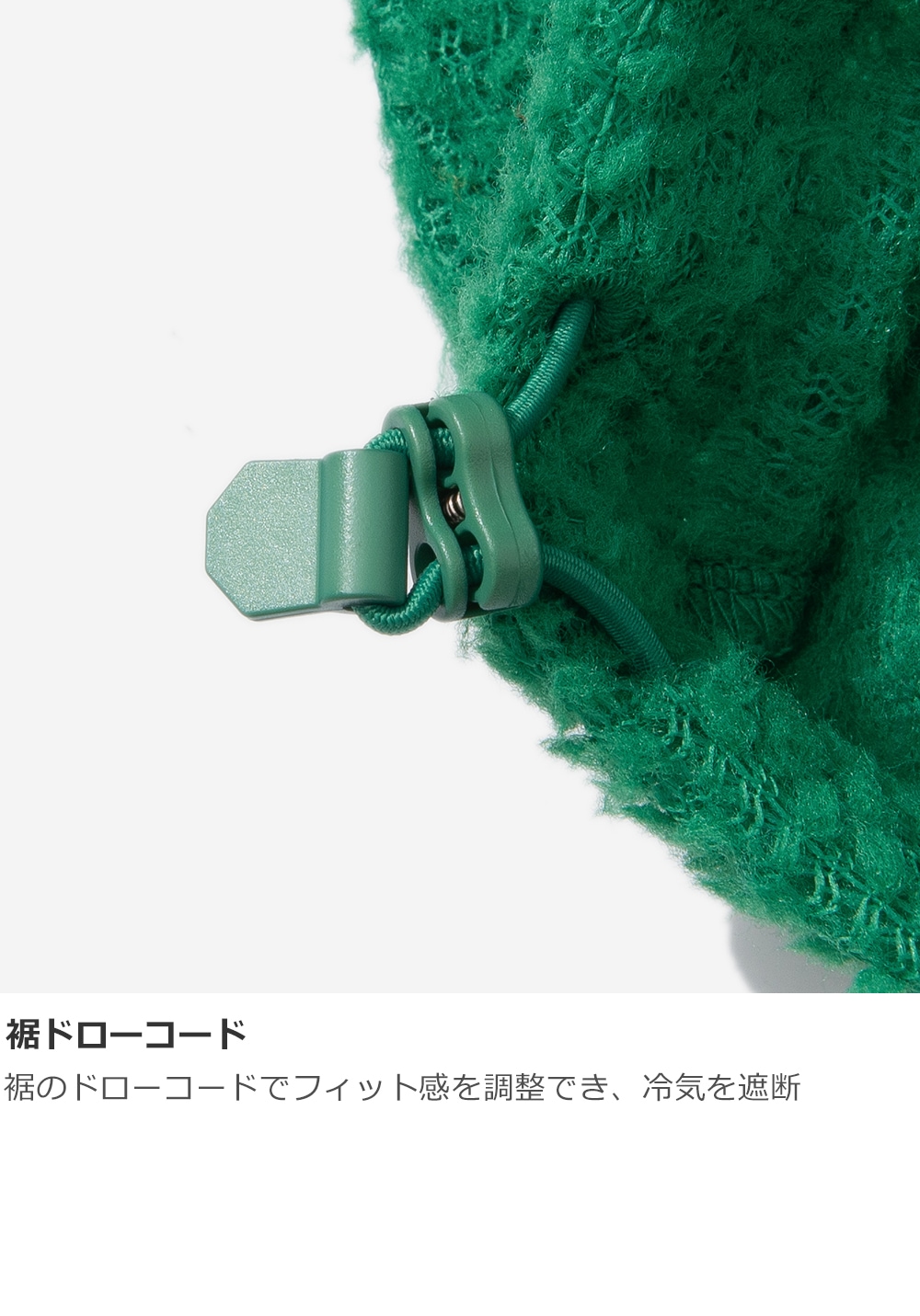 首元は伸びにくいリブ仕様のラウンドネック、腰回りはフィット感を調整できるデザインで、冷気を防ぎつつシルエットの変化も楽しめます。