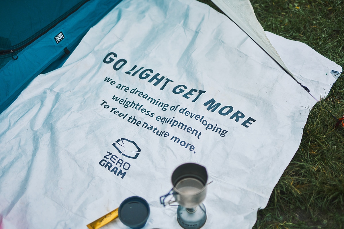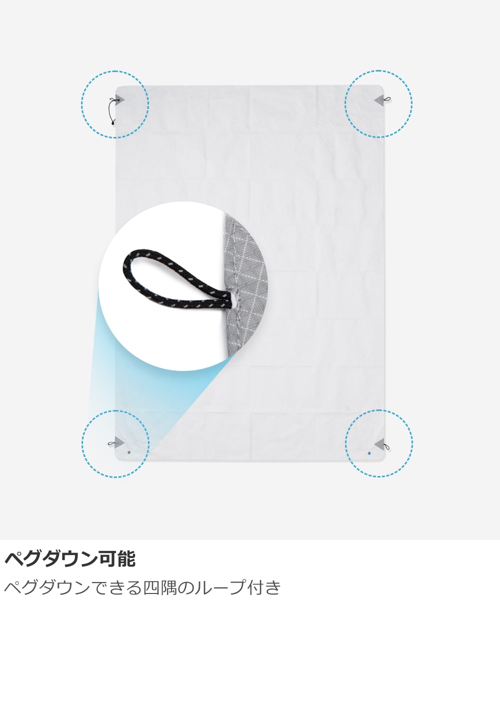 ペグ固定用のループが四隅についています。コンパクトに折り畳んで付属のゴムで固定でき、専用スタッフサック付。(ゴムのハトメ部分はUHMVPEで補強)