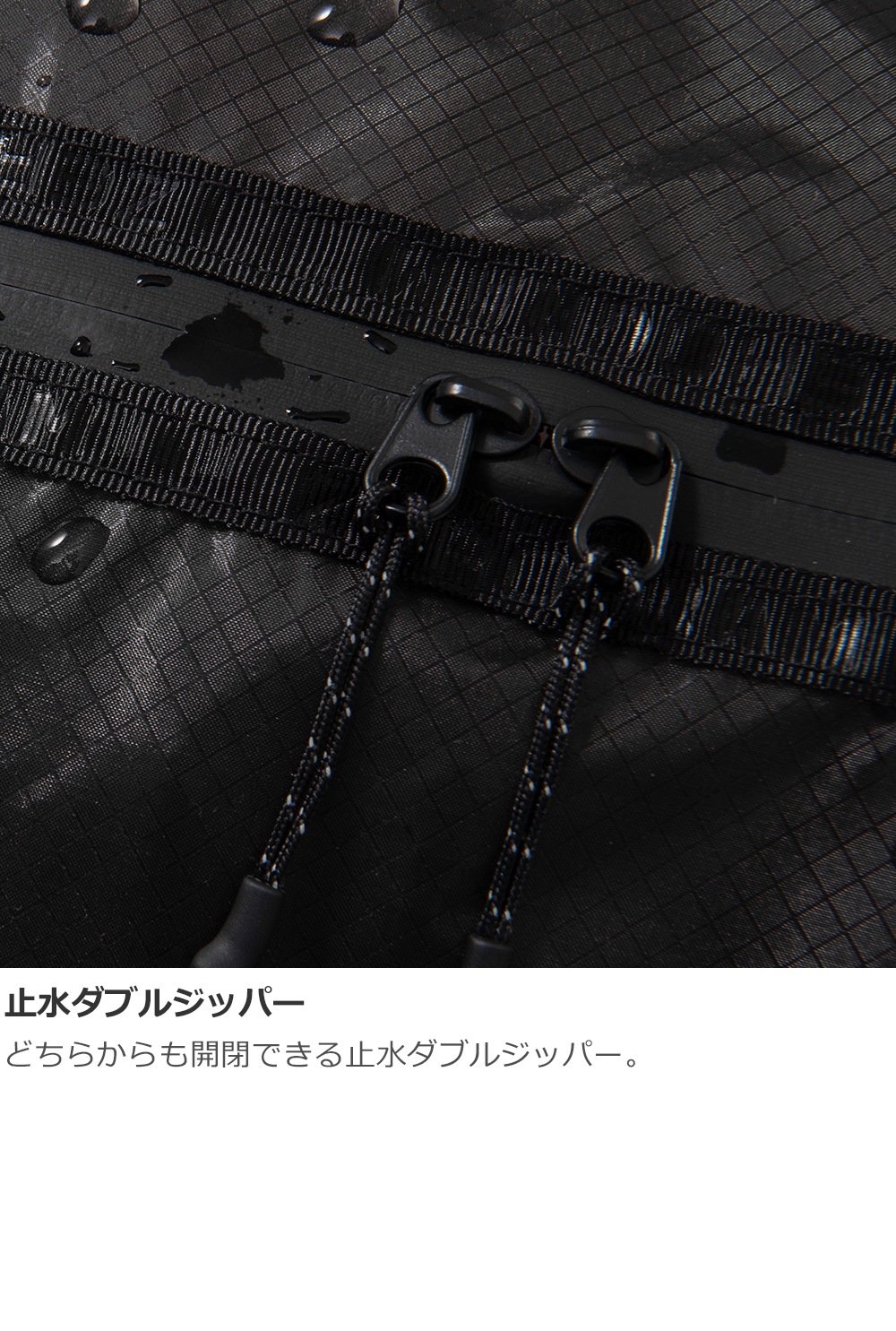 Silicone/UTSコーティングを施した30デニールのCORDURA nylon素材で軽量で耐久性・高撥水性があります。防水ジッパーで外部からの湿気を防ぎつつ濡れたギアの収納にも対応します(完全防水ではありません)。