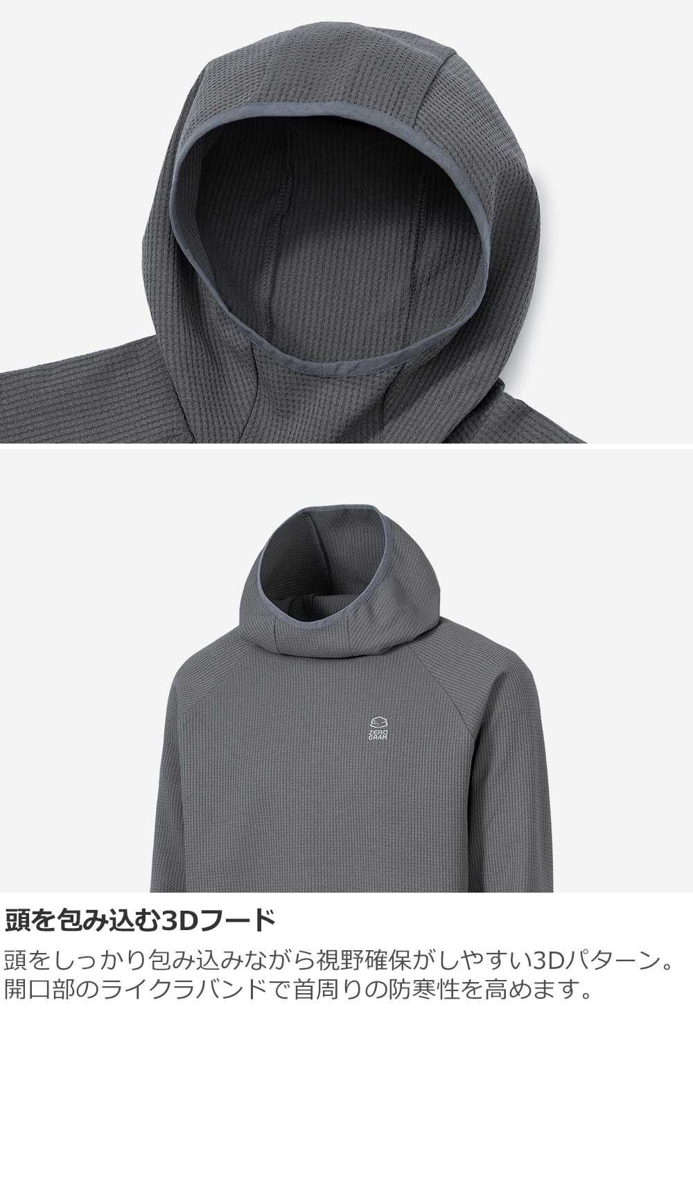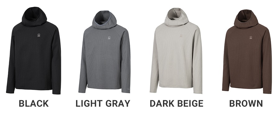頭から首回りを守るフーディー型で秋冬はベースレイヤーとして、春は1枚でさらりと。保温性と通気性に優れているのでアクティブインサレーションとしてもおすすめです。シワになりにくいため夏のテント泊で夜間や明け方の冷える時間帯にさっと羽織るのにも便利です。