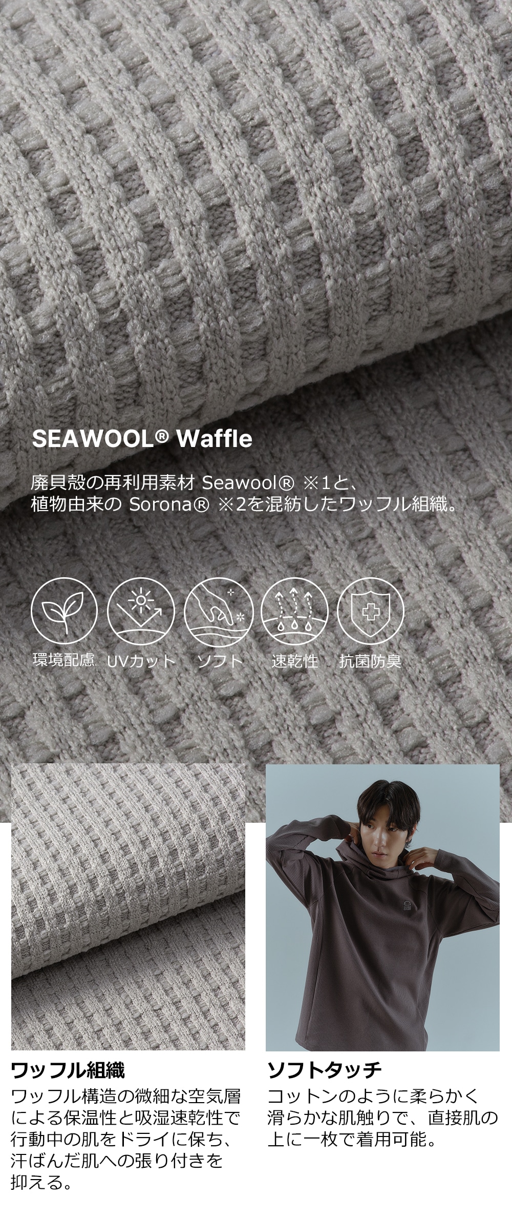 ※1 SEAWOOL® :廃棄されたカキ殻とリサイクルされたPETプラスチックボトルを融合、天然ミネラルを含み防臭性・吸湿速乾性・UVカット機能を持つエコ繊維。
