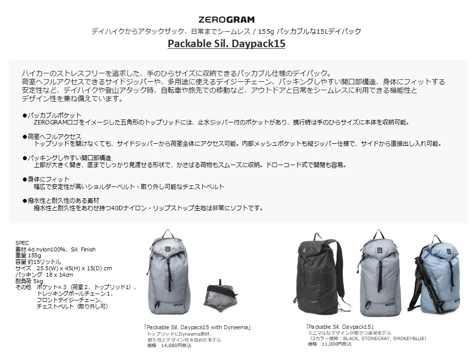 パッカブルになるのでデイハイク用に持参。街ではPCを入れて仕事場へ移動できます。