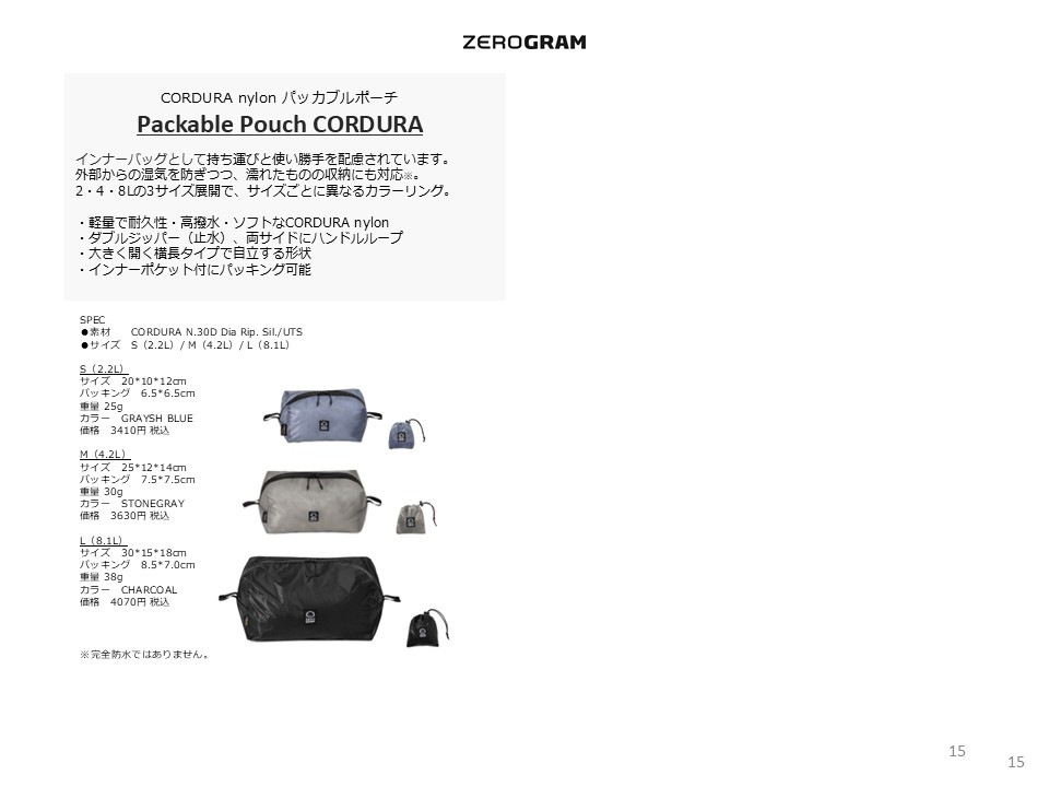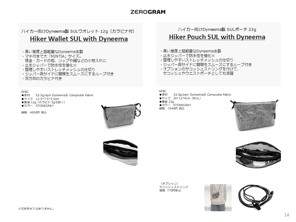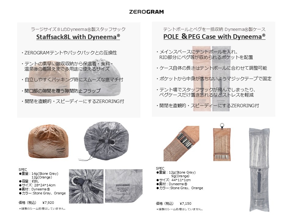 Dyneemaシリーズ:「StuffSack 8L with Dyneema」「POLE&PEG CASE with Dyneema」「Hiker Pouch SUL with Dyneema」「Hiker WALLET SUL with Dyneema」