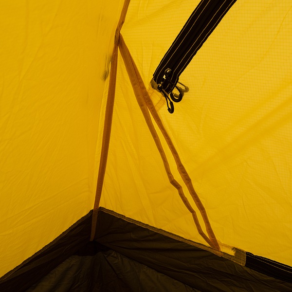 ・テンション高く引き上げるZEROBONEポールによって、フライだけでなくインナーテントも引きあがっています。そのため天井高さが上がっています。また壁のたわみも改善され同じフロアサイズながら居住空間は広く感じられるでしょう。